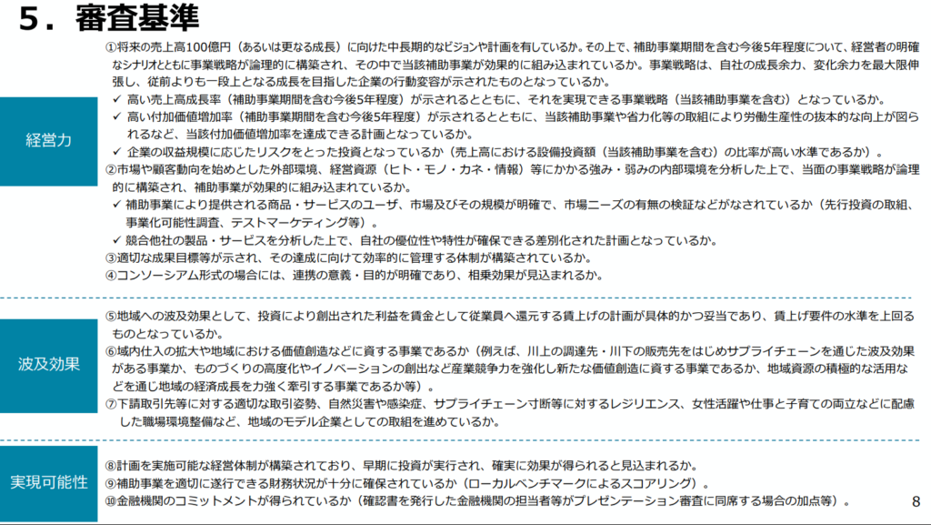 これは、書類だけでは測れない「社長の想い」や「売上高100億円に向けた中長期的なビジョン」、事業への熱意、覚悟を経営者自身の言葉で確かめるためです。 経営者自身の覚悟や熱意、さらにチームを巻き込んで推進できるリーダーシップは、計画の実現性を左右する要素として重視されます。
