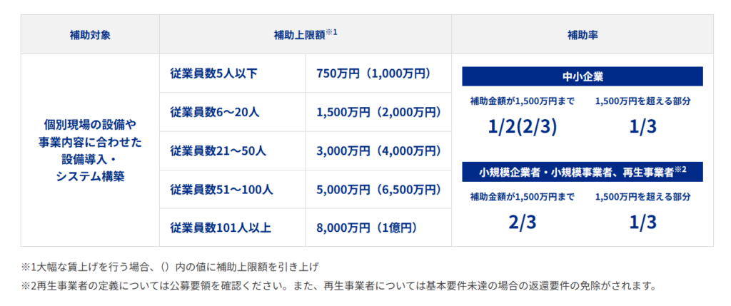 生産性向上・売上拡大を実現するため、生産・業務プロセス、サービス提供方法の省力化、人手不足解消に効果があるデジタル技術等を活用した設備導入が対象